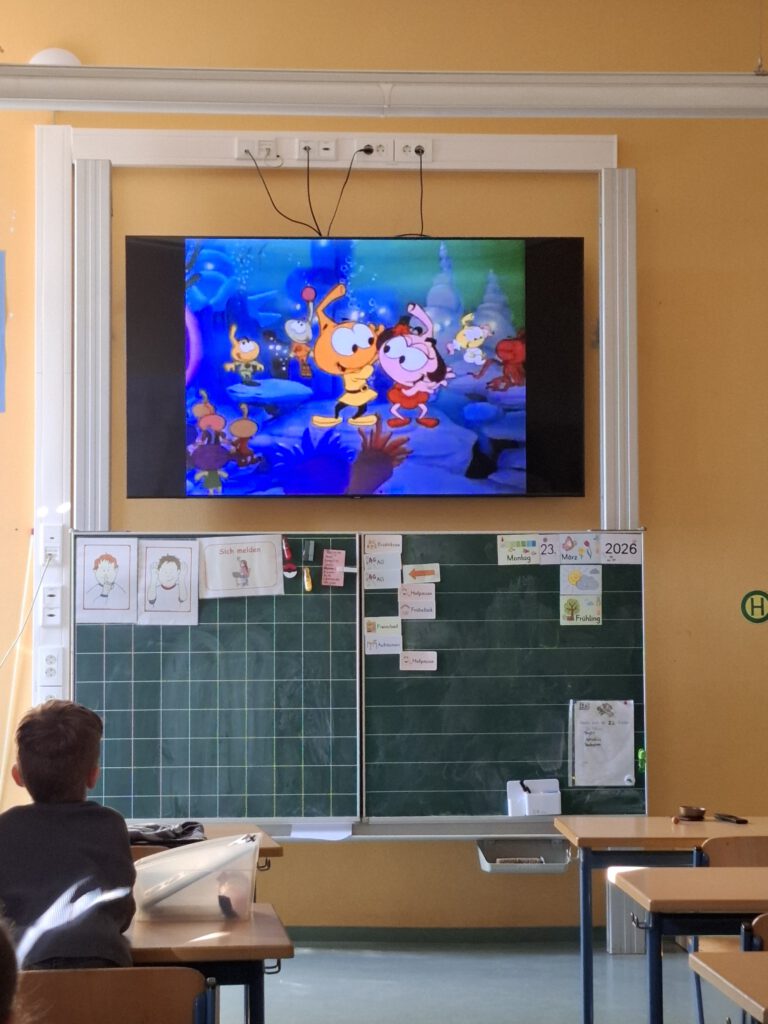 Inhalt: „Eumel und Emi finden Twinky. Einen ganz besonderen Stern. Sie lernen Bruno kennen und der hat einen Kindertraum!“ (Eumel und Emi / Twinky !Spende!). Beim Vorlesen wurden die Kinder stets mit einbezogen und angesprochen. Viele lauschten gespannt und beteiligten sich rege. Am Ende erhielten alle Zuschauer eine Geschenk-Karte mit QR-Code für drei Hörbücher von Herrn Sassenroth zum Anhören zu Hause oder in der Schule. Außerdem erhielt die 1a eine EMI als neues Mitglied der Klasse und die 1b einen EUMEL.