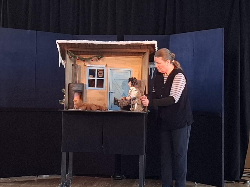 Unsere 1.- und 2.-KlässlerInnen wurden von einer Puppenspielerin bei uns in der Schule bespielt. Nach einer Anfangsaufwärm-Phase, um den Weihnachtszauber so richtig in Schwang zu bringen, startete das Stück „Es klopft bei Wanda in der Nacht“.