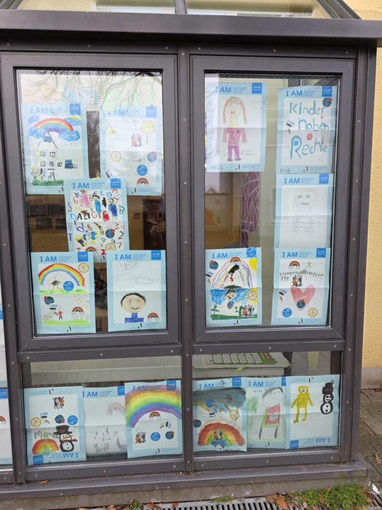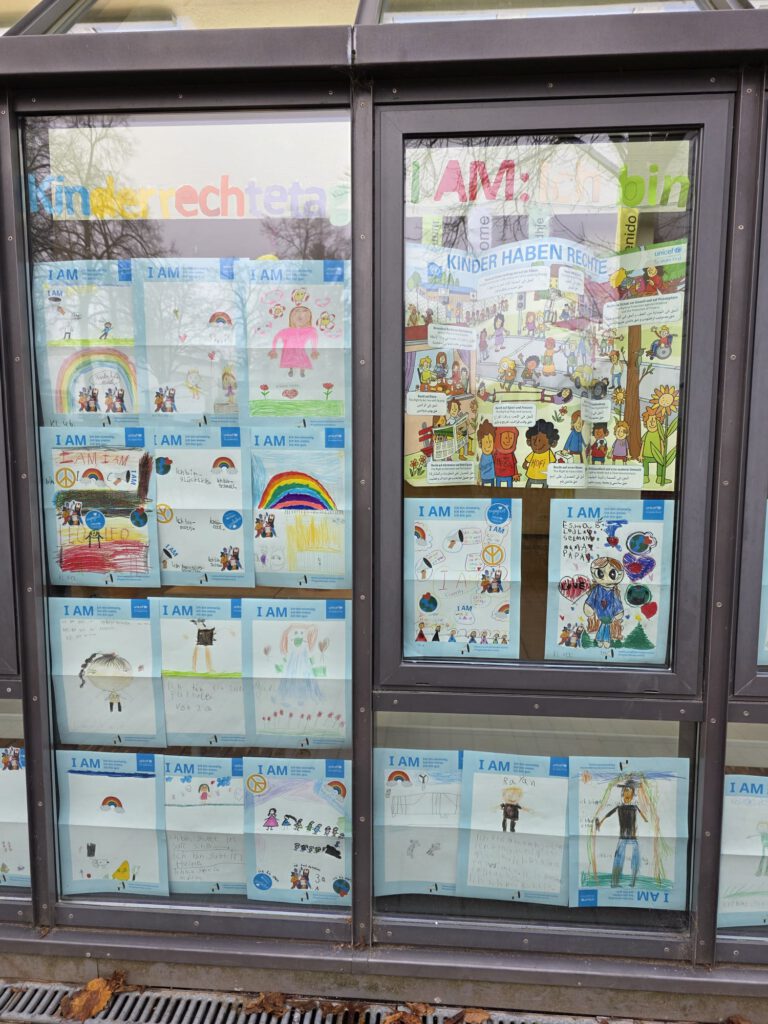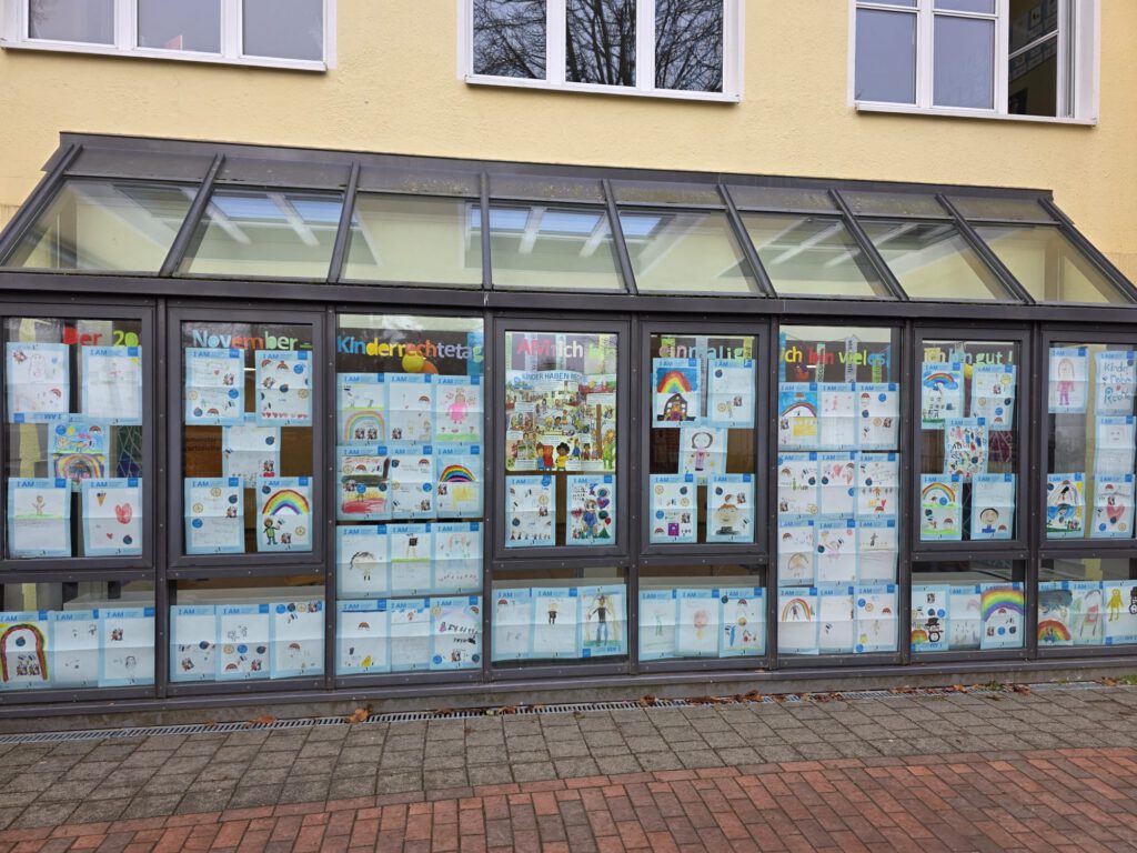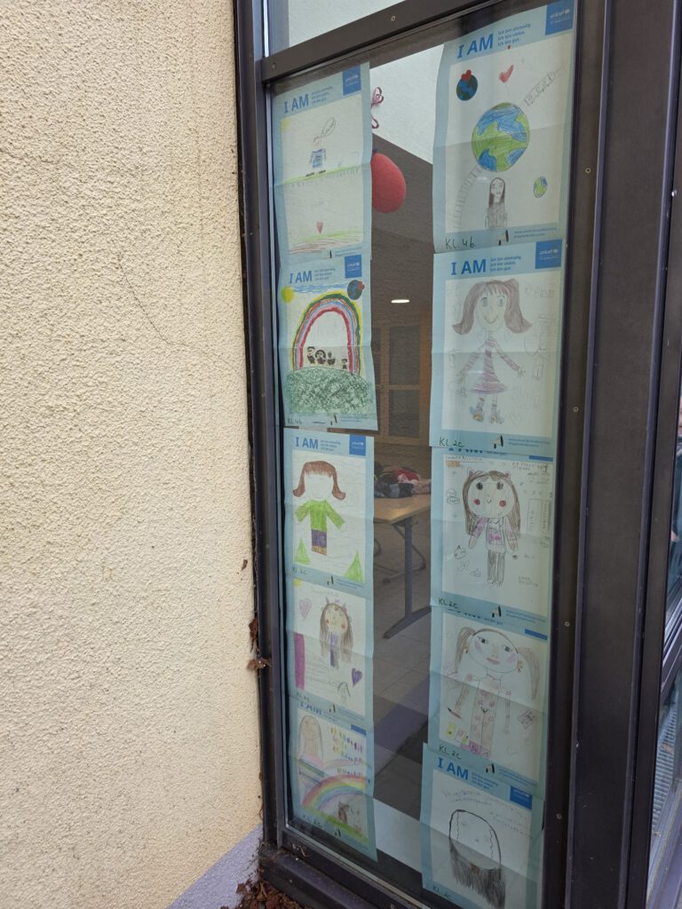 Am 20.11.2025 haben wir uns wieder am internationalen Tag der Kinderrechte beteiligt. Alle Kinder erhielten ein Plakat, auf dem sie schreiben, malen, zeichnen, basteln … durften, wer sie sind und was sie ausmacht. Anschließend wurden die Kunstwerke bei uns im gut sichtbaren Außenfensterbereich ausgestellt. Die Poster und Sticker wurden von UNICEF zur Verfügung gestellt. Danke dafür! Hier ein kleiner Ausschnitt der entstandenen Werke. Am besten sind die Werke natürlich vor Ort zu bestaunen 🙂